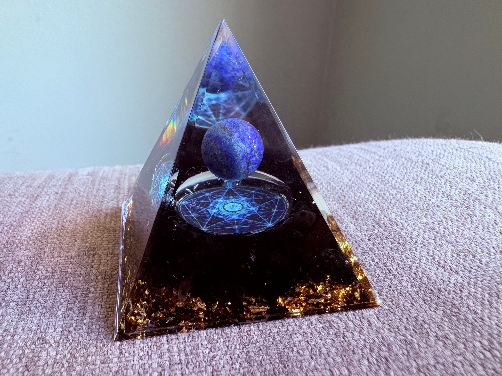 With its rich obsidian-black base and radiant lapis sphere, this orgone pyramid radiates protective energy and cosmic insight. The central sacred geometry grid amplifies focus, truth, and spiritual strength—while the deep hues keep negativity at bay.