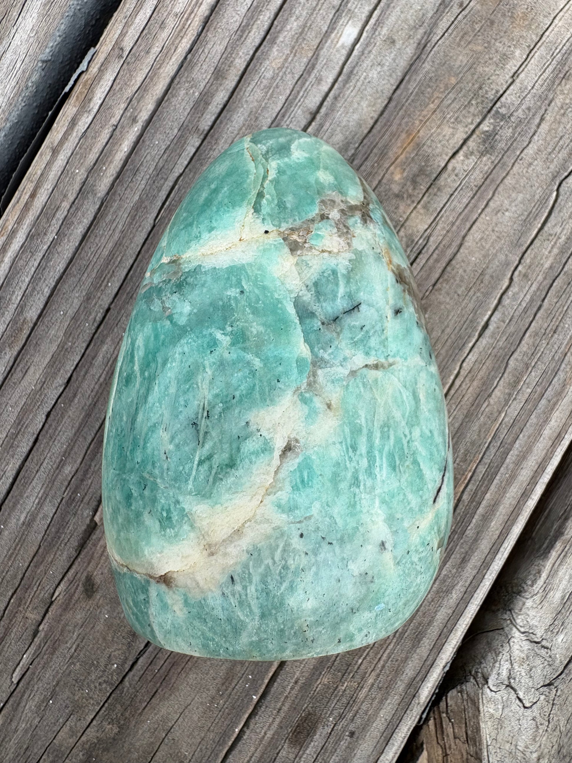With serene ocean tones and earthy veining, this Amazonite freeform looks like it was carved from the edge of a sea goddess’s sanctuary. Its tall, smooth shape fits beautifully in your palm or sacred space—radiating calm, clarity, and aligned expression.
