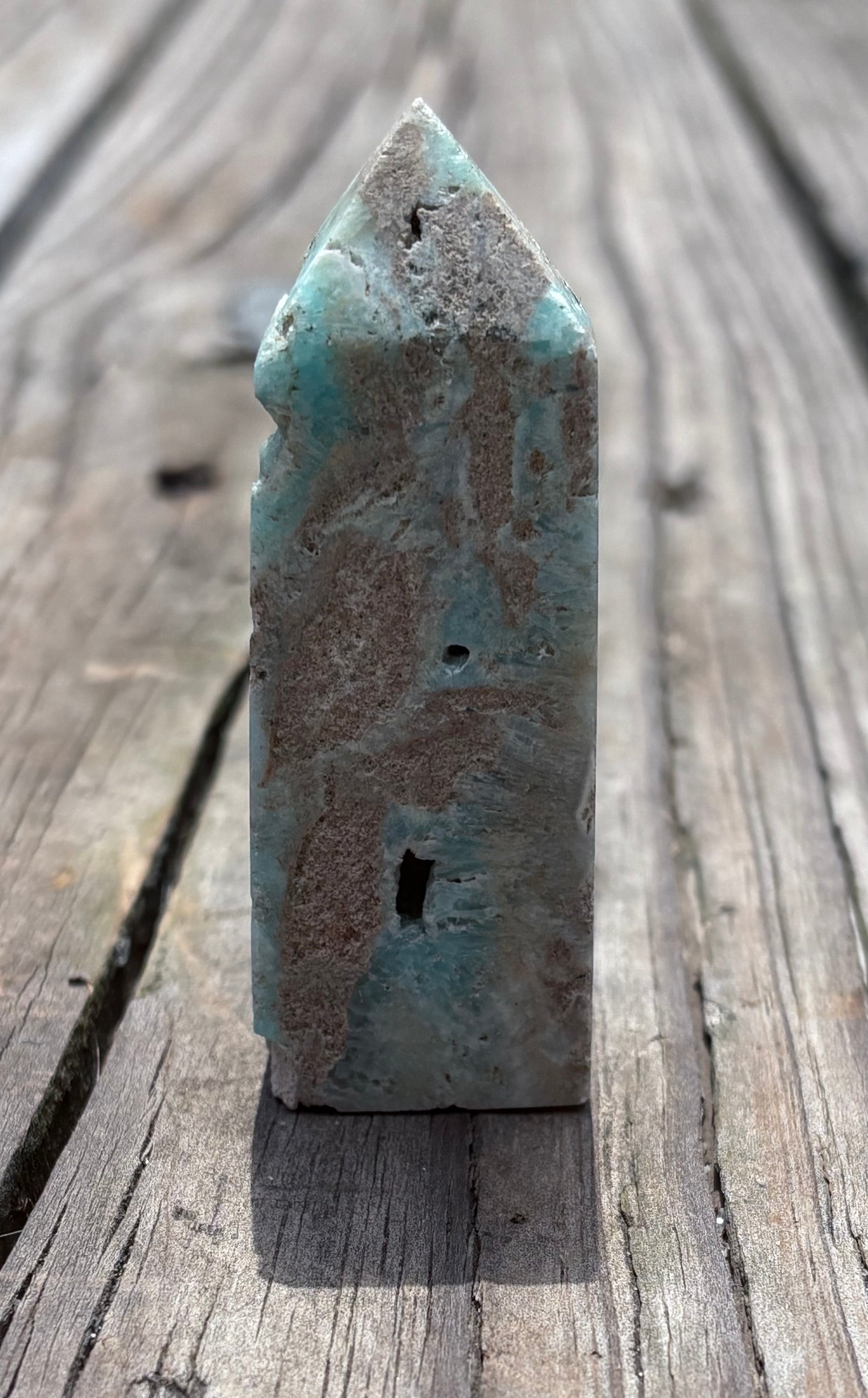 This raw-yet-glowy tower carries the calming essence of sea foam and weathered driftwood. Caribbean Calcite blends soothing aqua blues with sandy browns in the most naturally dreamy way—like a tropical tide frozen in stone. Every curve and crevice in this piece feels intentional, as if the Earth sculpted it during a moment of stillness.