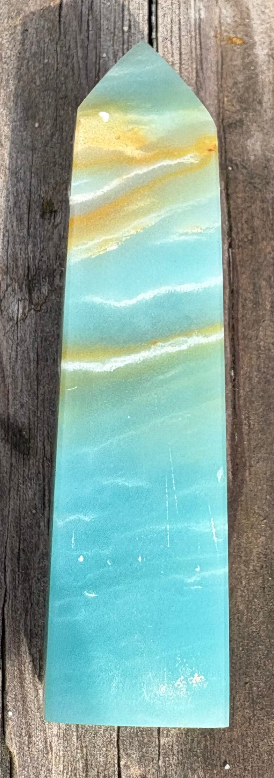 This serene tower is like holding a tropical breeze in your hand. With soft seafoam blues, golden sand-like ribbons, and gentle wave-like bands, this piece captures the calming energy of the coast. Its dreamy palette makes it a perfect accent for any peaceful space or moment of stillness.