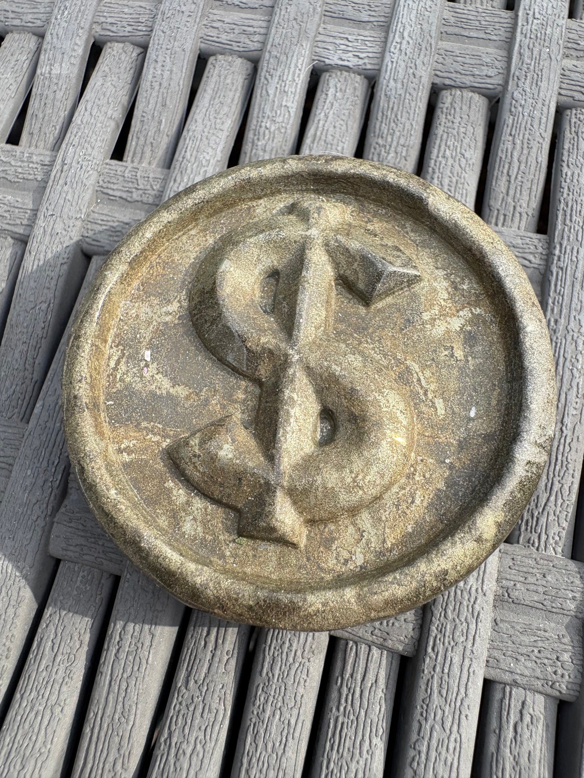 A smooth, grounding piece that feels as ancient as it looks, this 2-inch round weighs 2.3oz and gleams with a weathered gold shimmer carved into a raised dollar sign—bold, unbothered, and magnetic. You can almost feel the energy of abundance sealed right into it.