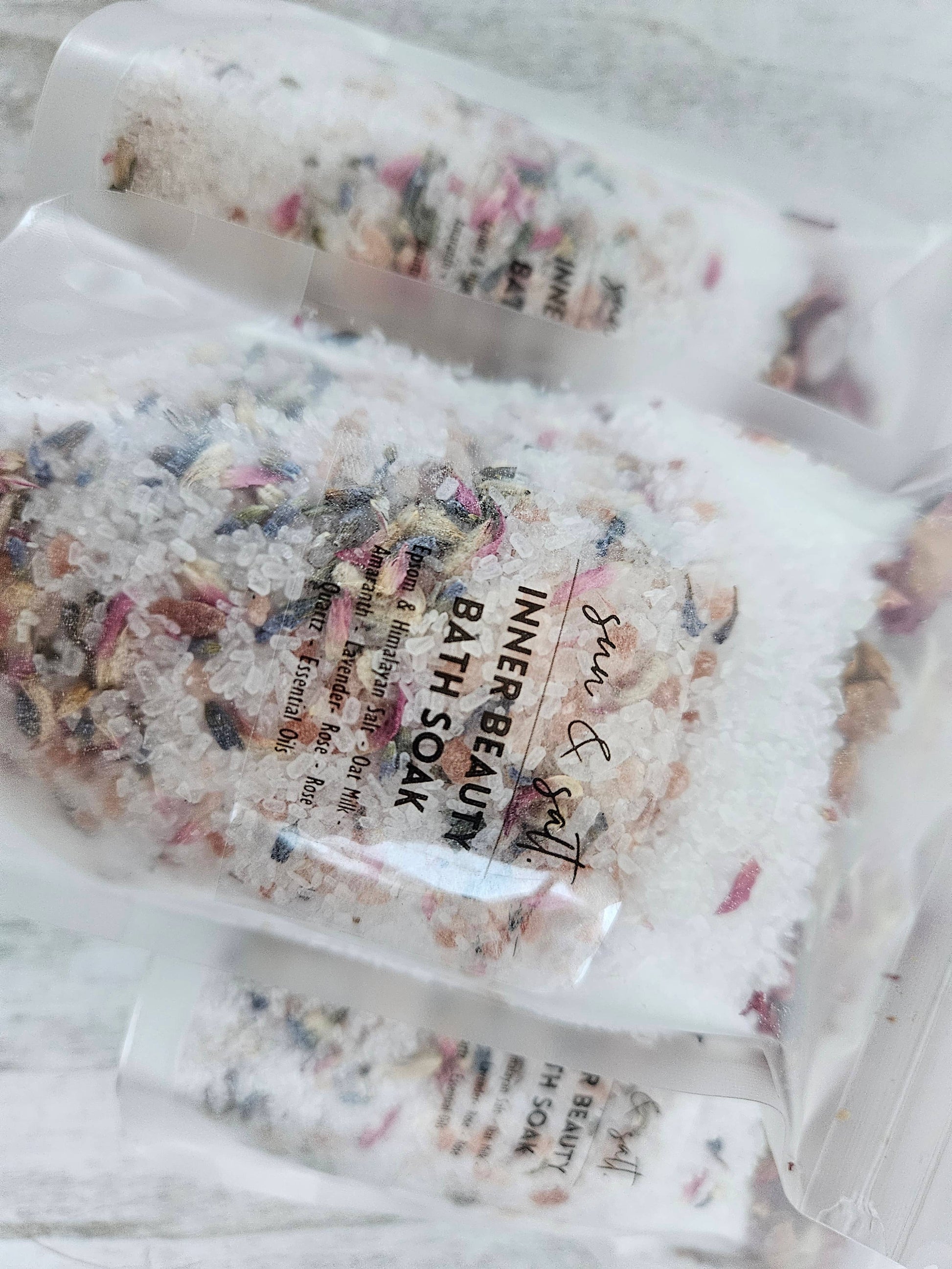 Made with both Epsom and Himalayan Salts, Amanath, Lavender, Oat Milk, and Essential Oils. Topped with Rose, Amaranth Globes, Rose Quartz.