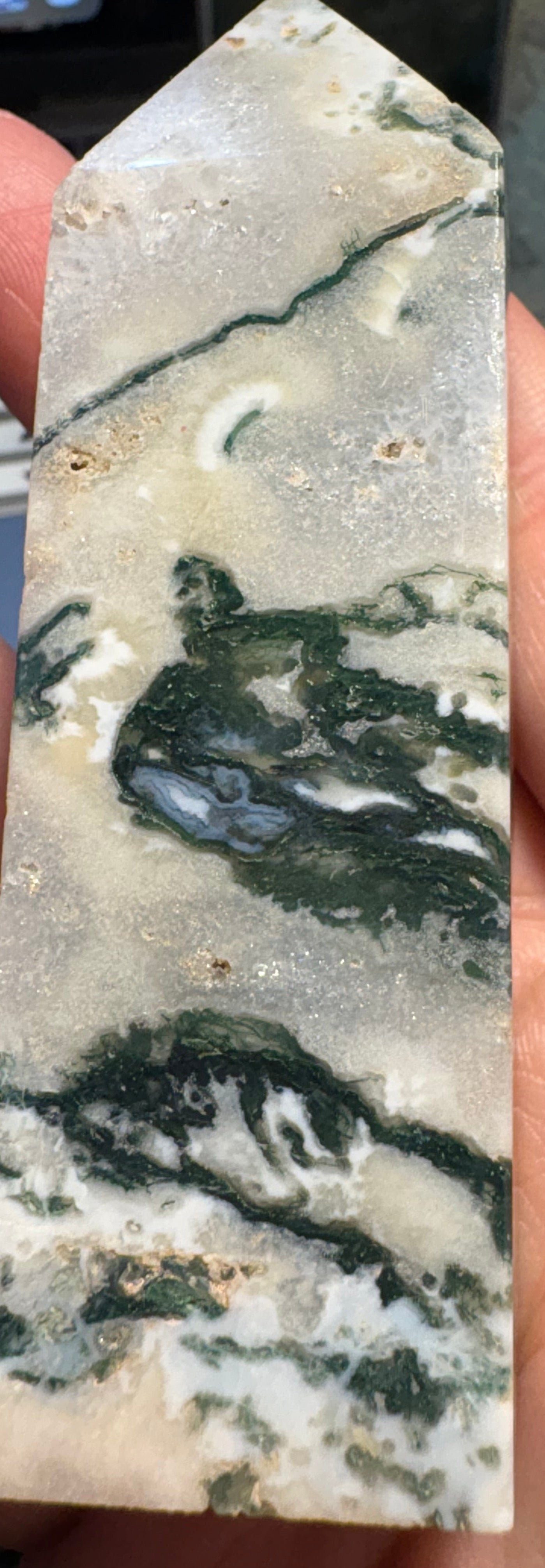 This nature-kissed Moss Agate tower looks like a forest frozen in time — with rich green “mossy” inclusions swirling through creamy white stone like a misty woodland morning. It’s like holding a living landscape. Known as the gardener’s stone, Moss Agate is deeply connected to growth, abundance, and nature’s healing touch.