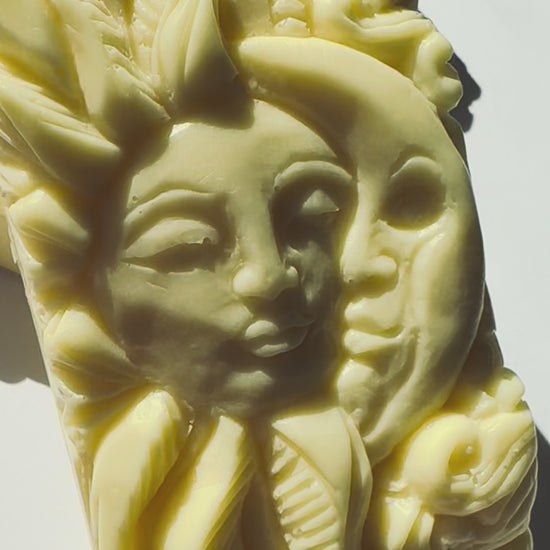 A celestial dance captured in soap form — this handcrafted bar features a radiant Sun and serene Moon entwined in perfect balance. With its vibrant yellow hue and detailed 3D carving, this bar brings warmth, light, and calm to your self-care ritual.